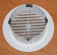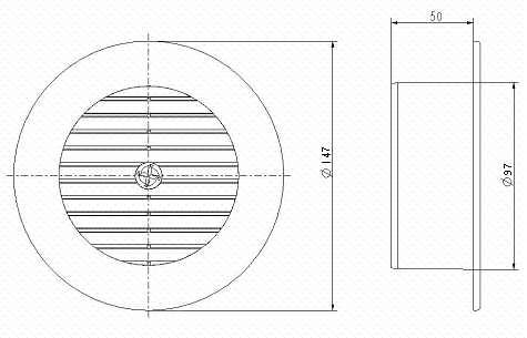 Ez egy esővédős szellőző rács a fal külső oldalára, horganyzott rovarhálóval, UV stabilizáló adalékkal ABS-ből. Széles peremmel készítjük, hogy jól takarja a falfúrási hibákat. Perem szélessége: 25 mm, a csőcsonk min. 98 mm belső átmérőjű csőbe tolható be, és a csőcsonk hossza: 50 mm. A csőcsonkra fémkarmokat szerelünk, amelyekkel a csövekben a rács jól megkapaszkodik, ezért az esetek többségében ragasztás, és csavarozás nélkül szerelhető.
