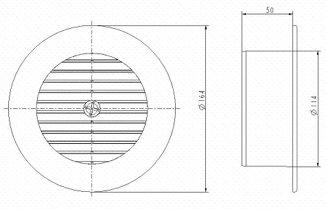 Ez egy esővédős szellőző rács a fal külső oldalára, horganyzott rovarhálóval, UV stabilizáló adalékkal ABS-ből. Széles peremmel készítjük, hogy jól takarja a falfúrási hibákat. Perem szélessége: 25 mm, a csőcsonk min. 118 mm belső átmérőjű csőbe tolható be (ilyen az NA125 KGPVC, NA120 alu), és a csőcsonk hossza: 50 mm. A csőcsonkra fémkarmokat szerelünk, amelyekkel a csövekben a rács jól megkapaszkodik, ezért az esetek többségében ragasztás, és csavarozás nélkül szerelhető. Készül: Fehér színben, illetve fémgőzöléssel megrendelésre, több árnyalatban.